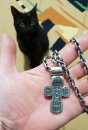Изображено на кресте: Распятие Христово. Святая Троица. Святой Николай Чудотворец. Мученик Трифон. Три святителя. Икона Божией Матери "Толгская". Ангел Хранитель. Преподобный Сергий Радонежский. Святой Спиридон Тримифунский.1. Размер: 7 х 4 мм